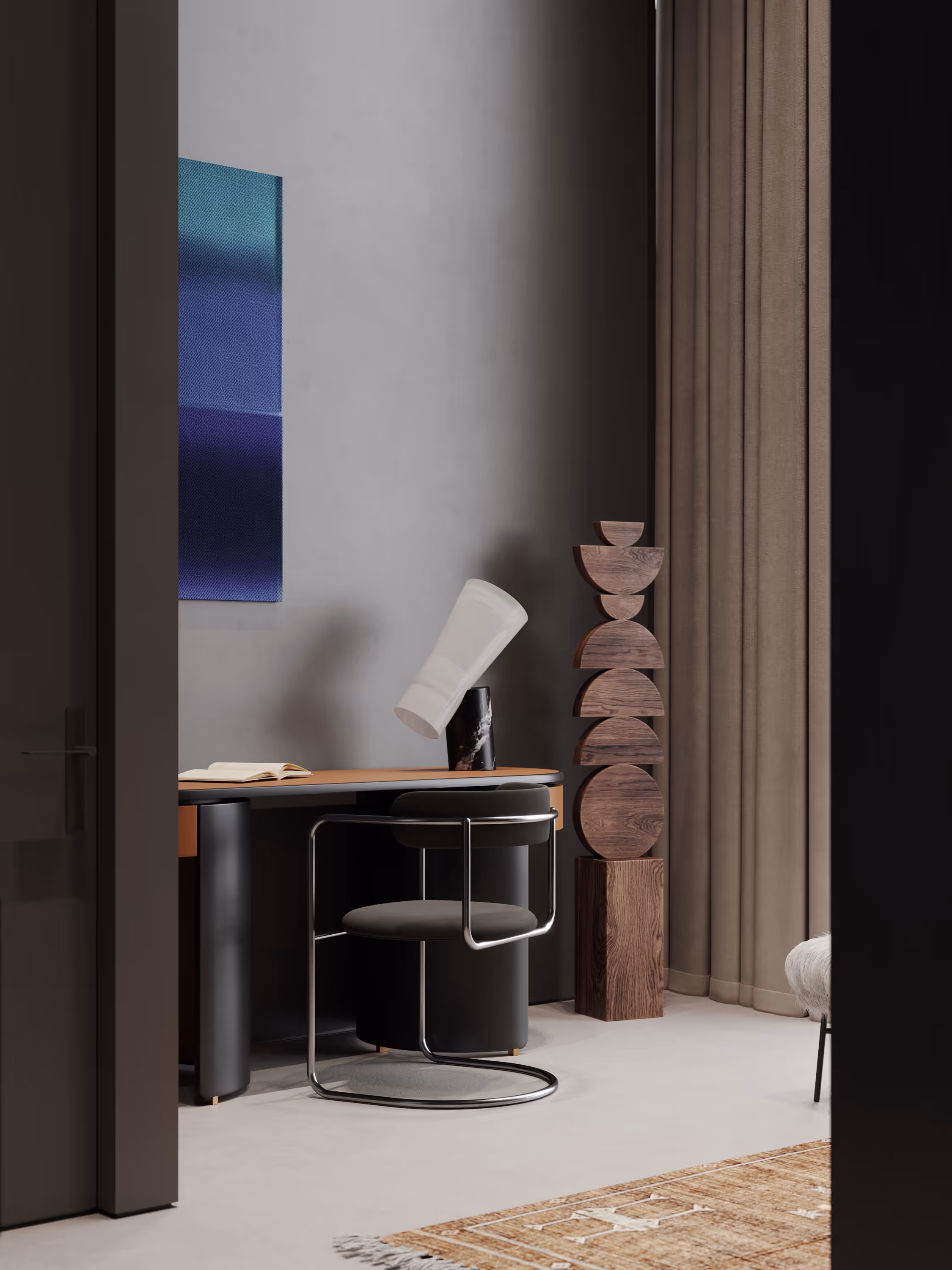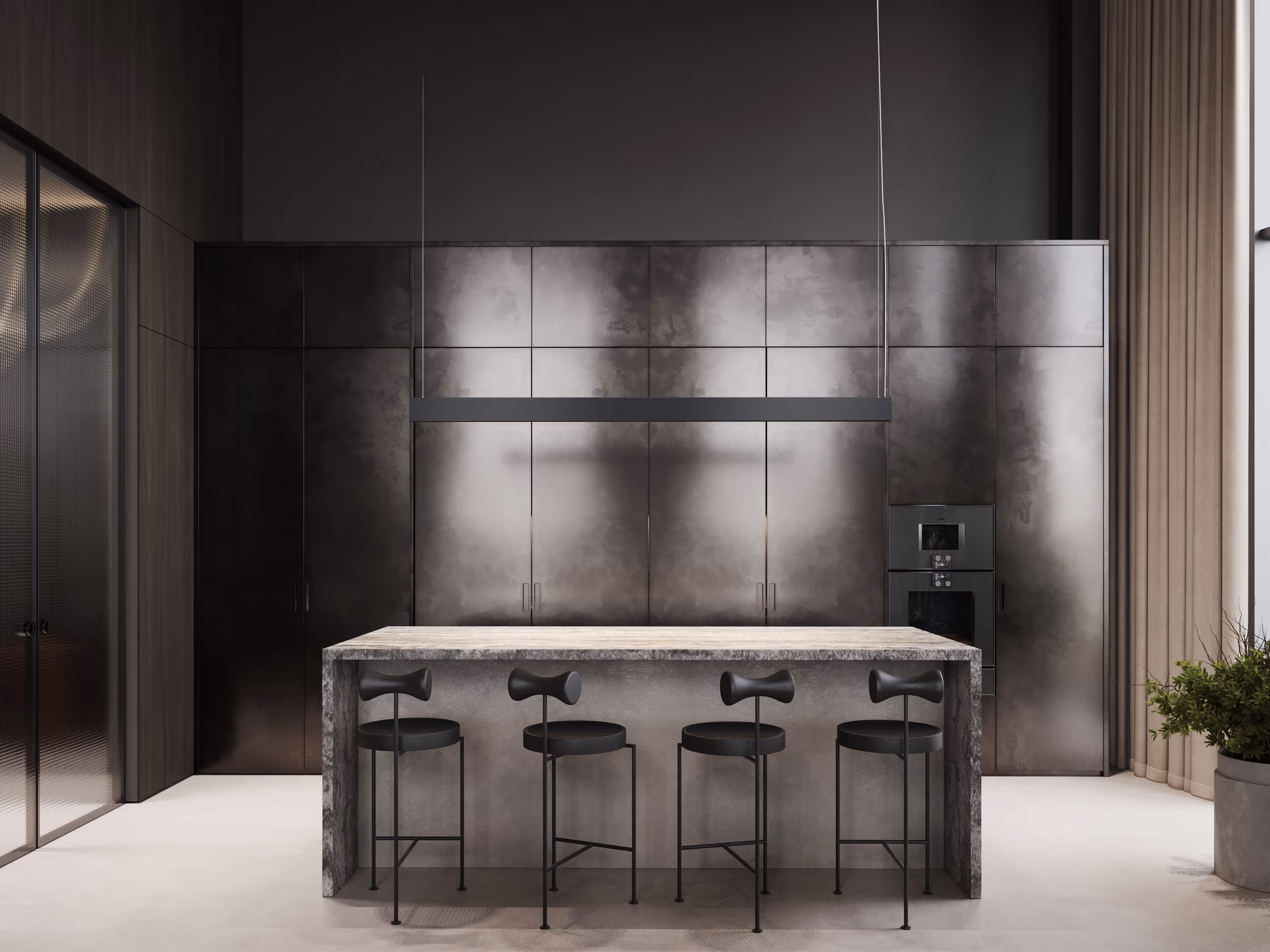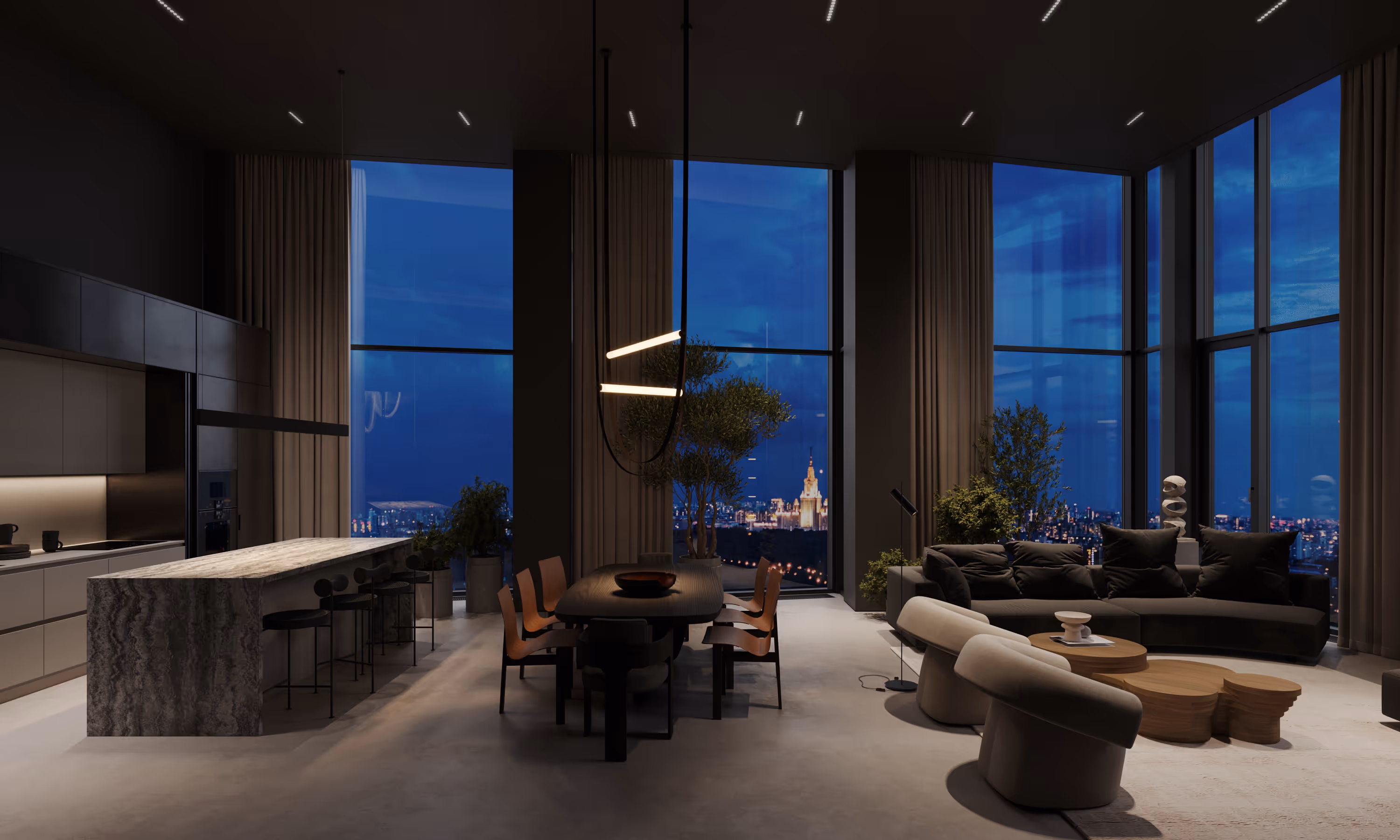 The stylish penthouse full of art and designer furniture was designed for demonstration and future sales. The core of the project is dark monochrome finishes. The main aim was to develop a functional layout and a unique interior design concept to demonstrate to future property buyers the big potential of a penthouse and life in it. The high-quality visualisations were used by the developer for marketing and advertising purposes. The penthouse is designed to appeal to modern, active individuals who value time and comfort. Every element of the concept is thoughtfully aligned with this target audience, ensuring the space meets their expectations for functionality, style, and convenience.
