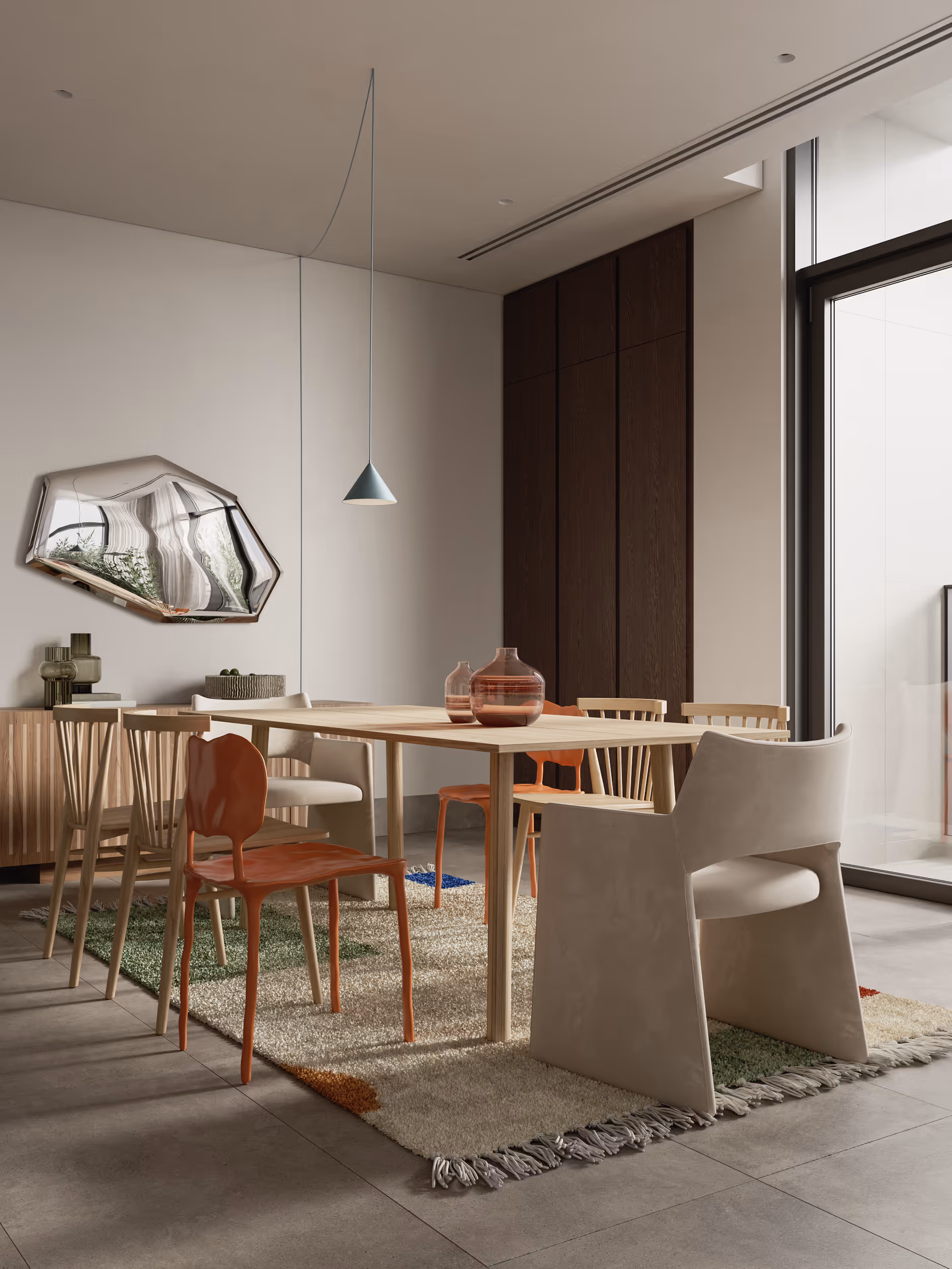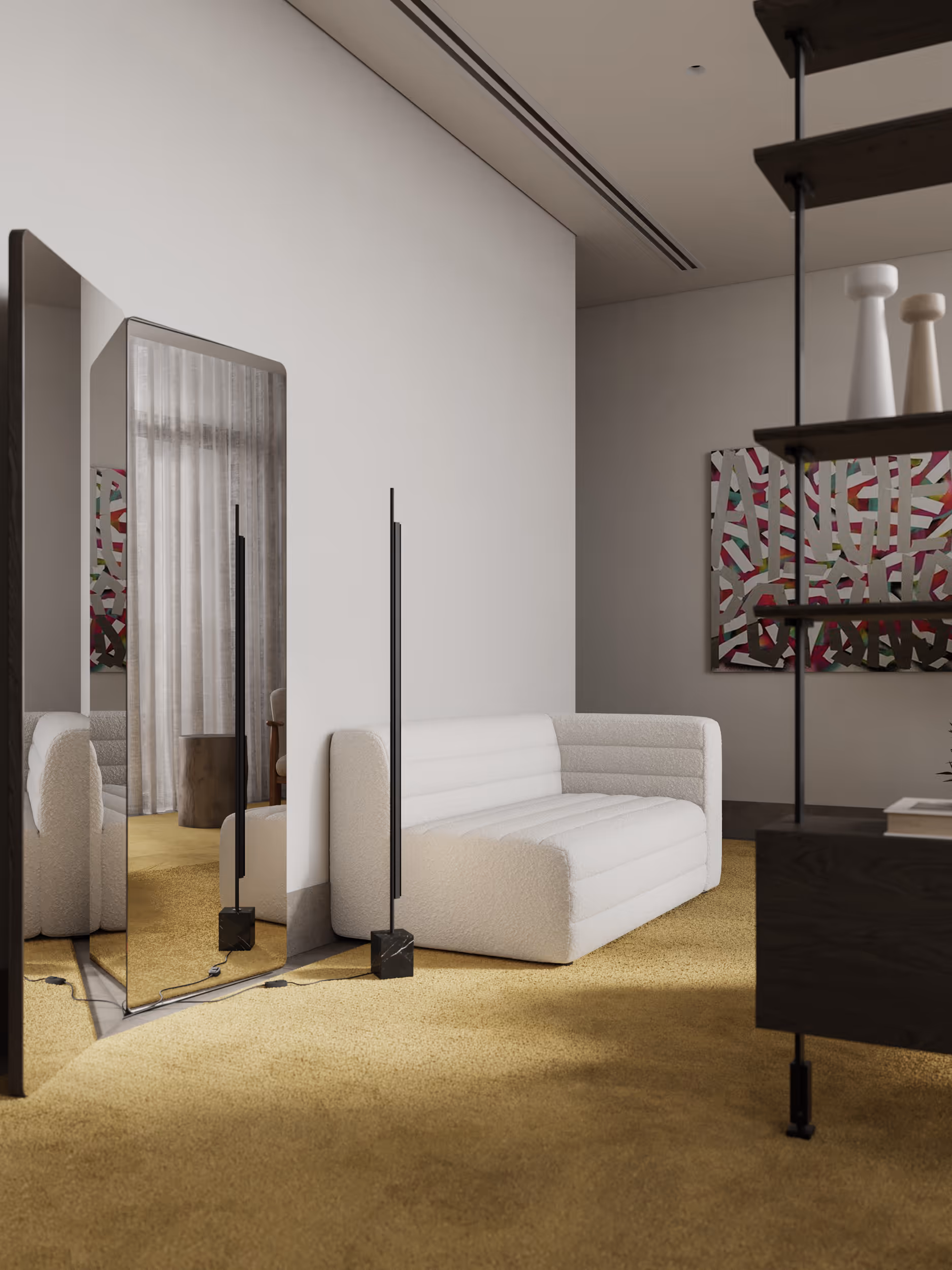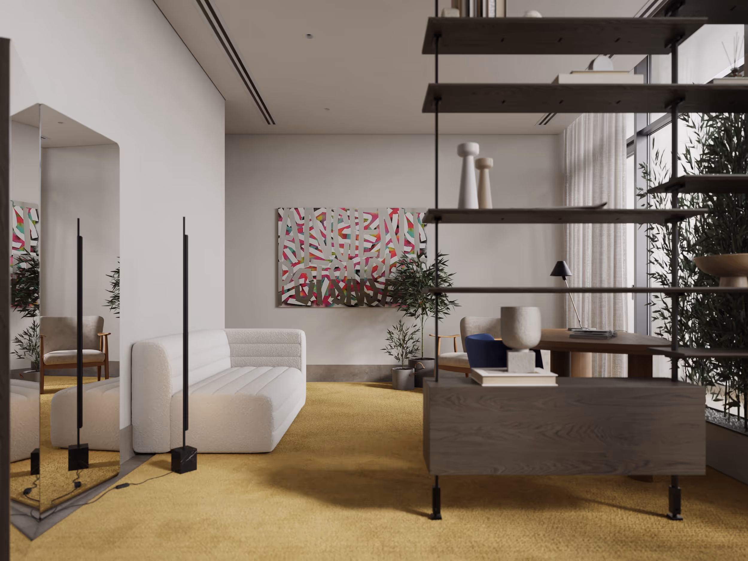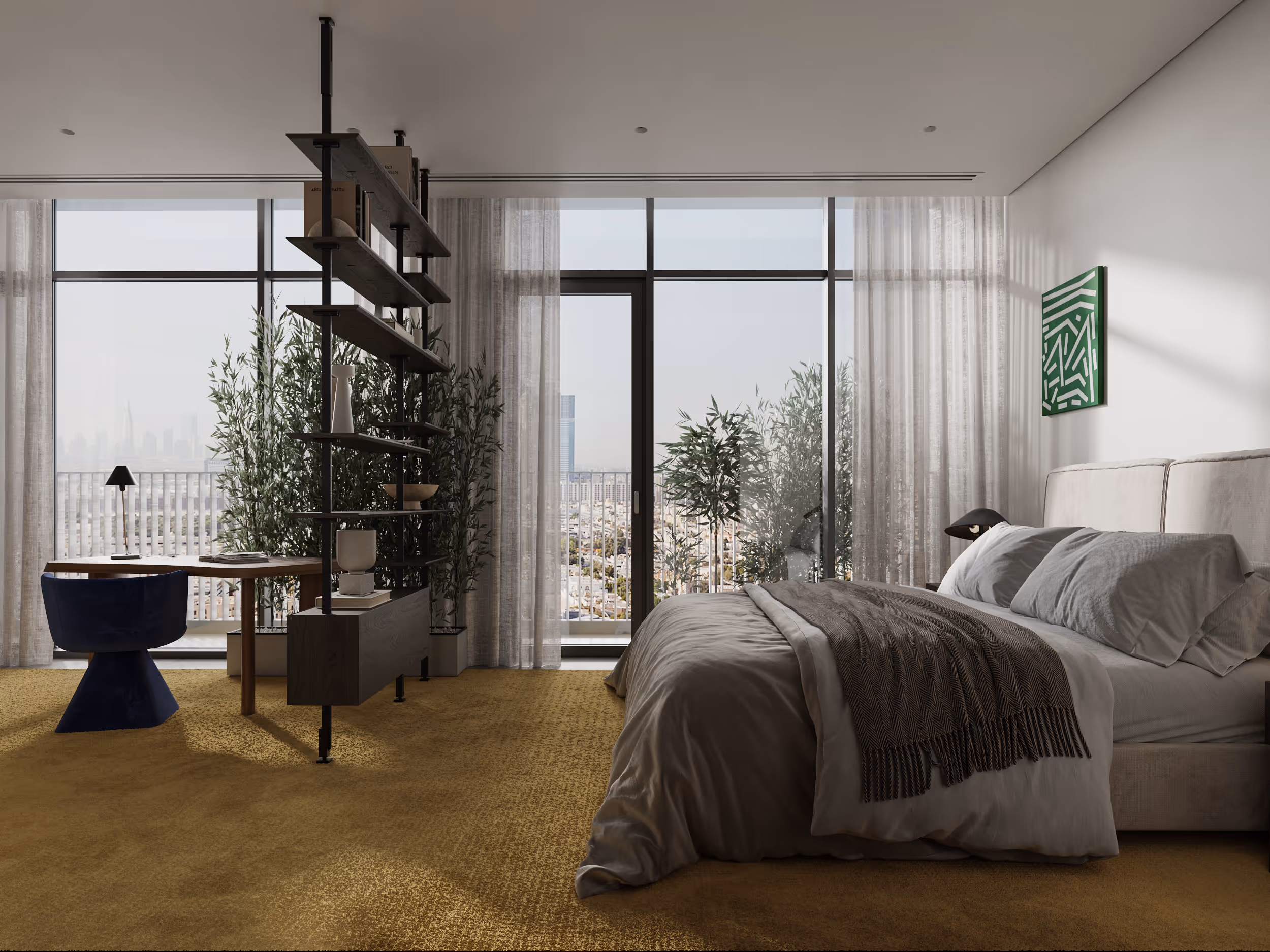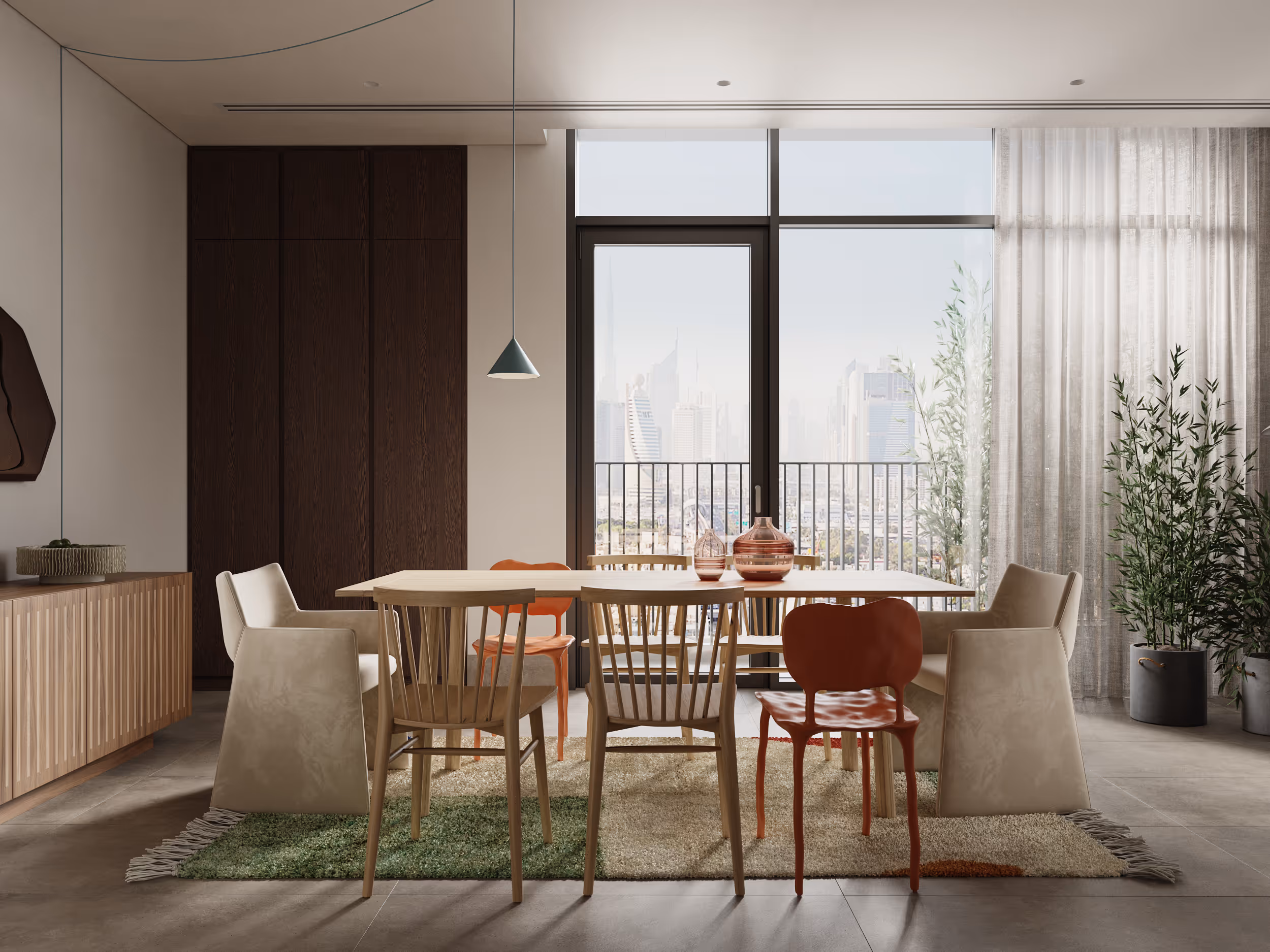 The light-filled apartment in Jumeirah was designed with a harmonious blend of elegance and warmth. The neutral finishes provided the perfect canvas for infusing the space with personality and charm. A plenty of green plants, wooden finishes, vibrant textures, and ethnic motifs in the materials and decor were added. Carefully selected furniture, lighting, and decor from local suppliers create a sense of authenticity and connection to the region. Location: Jumeirah, Dubai, UAE