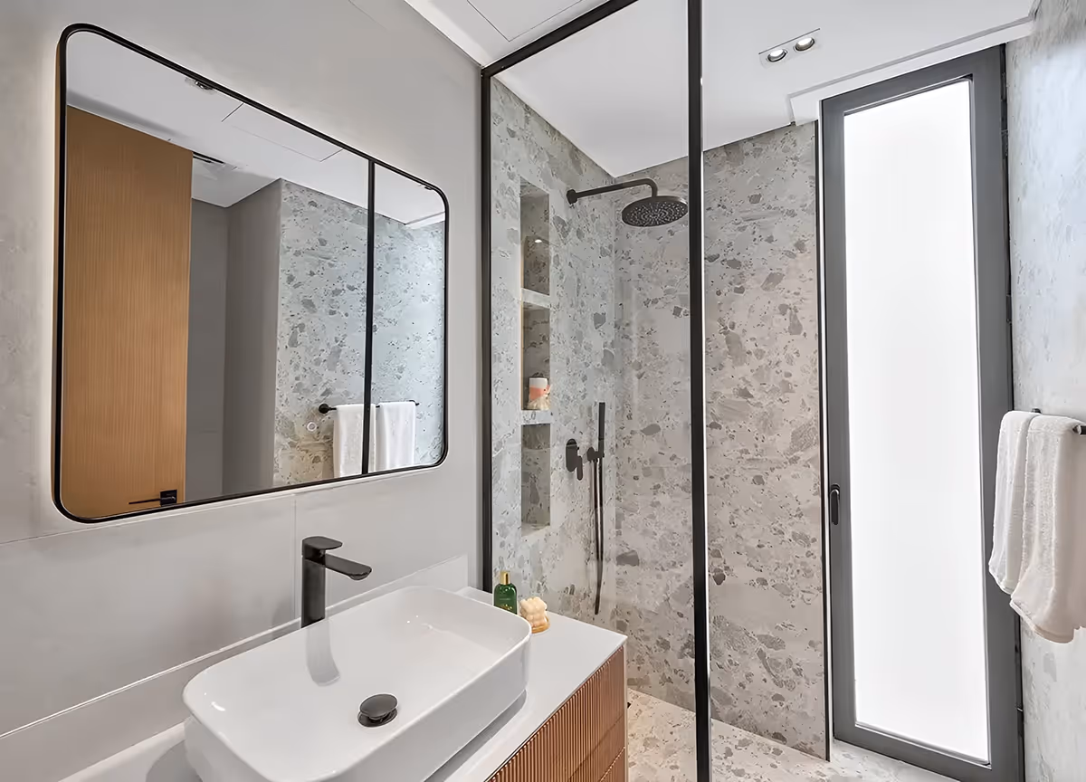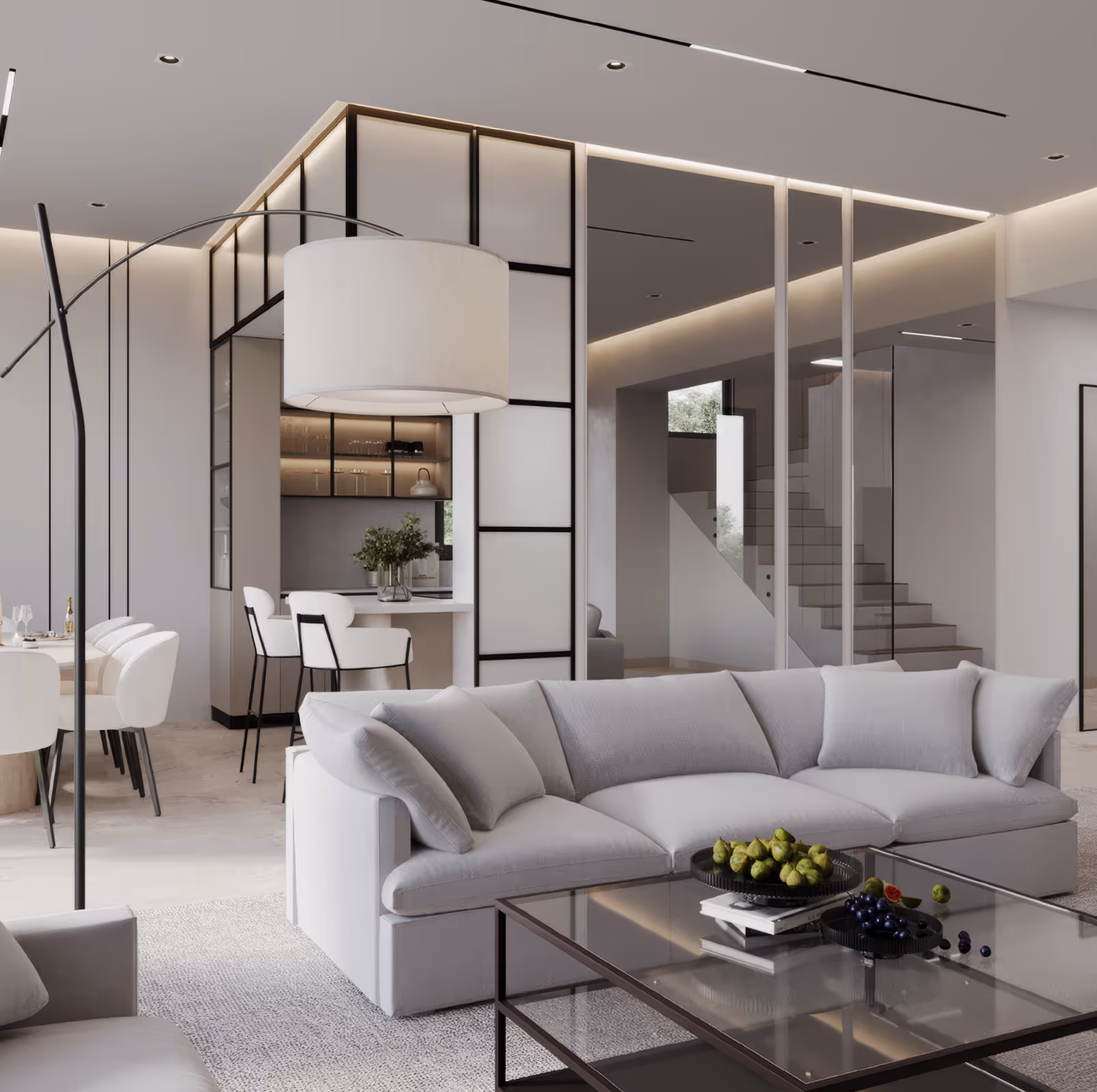 Purchased with builder’s finish, this Tilal Al Ghaf villa received a full design upgrade – including custom moldings, ceiling details, and integrated LED lighting. The interior was styled for modern comfort, with soft neutrals, clean lines, and curated decor. Outside, the property was enhanced with a natural-looking lagoon-style pool and a private basketball court. Every detail supports a move-in-ready, high-value property – ideal for fast resale in a premium community.